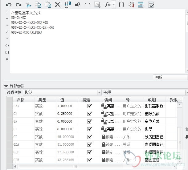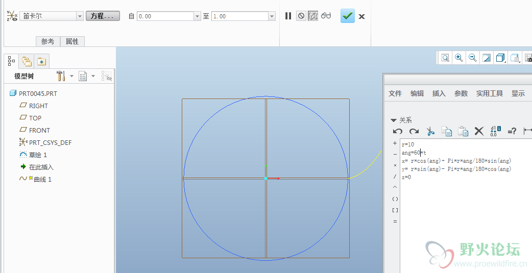 我们已知道笛卡尔坐标需要三个值:x,y,z。上面我们已经推断出了x和y值。因为曲线为2D曲线,z值当然为0。因此,上面的方程在Proe中应用如下: