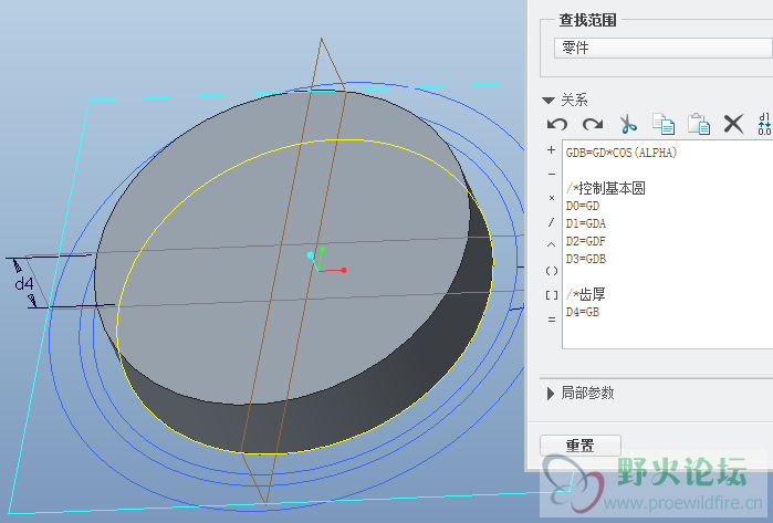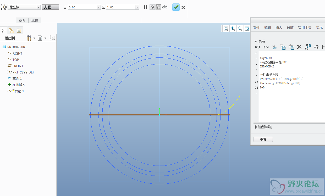 (有人会问,上面不是讲过,ang是从0到360度变化么?其实画齿轮,只要60度范围内的渐开线就够了,画太长了没必要。大家可以自己在Proe里改60为360,或者更大,比如720)