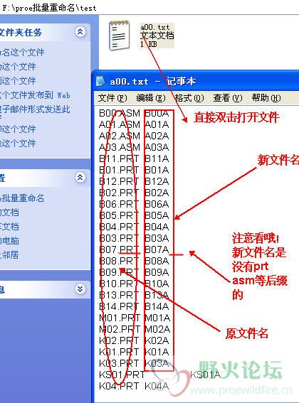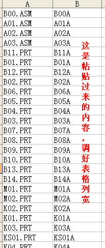 2.5 找到你刚才保存的文件,图中是a00.txt,双击打开。实际上,我们的主要操作就是针对这个文件进行的!就是要把右边的新文件名改成我们想的名称!直接修改也可以,但是我们想要更方便快捷一些,那么就可以复制到excel中来修改更快!按ctrl + a全选,右键-复制,在excel中新建一文件,直接在单元格中右键-粘贴。调整好列宽,方便后面操作,如图所示。