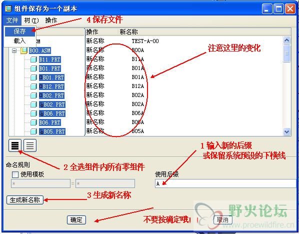 其实方法操作起来相当简单,先讲讲大概的思路。在组件保存副本时,输入新名称后系统会弹出对话框,要求是否要重新命名组件内的零件、子组件名称。此时选择全部零组件,全部重命名。此时,PROE可将这一重命名的操作保存成文件,文件内容即是原文件名与新文件名的一一对应关系。利于这一特性,我们对形成的这一文件中新文件名进行修改后保存,再重新导入到保存副本的窗口中即完成了重命名操作。