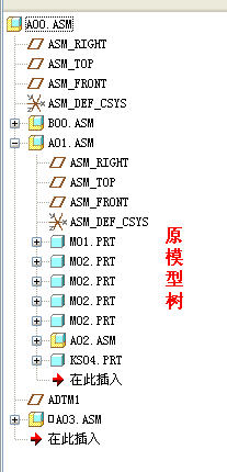 2.1 如图所示模型树,是一个项级组件(最高一级或称总装),里面包含了组件和零件若干个,当然这里面有些零件是有工程图的。我们的目的是要将这一组件内的所有子组件和零件进行重命名操作。